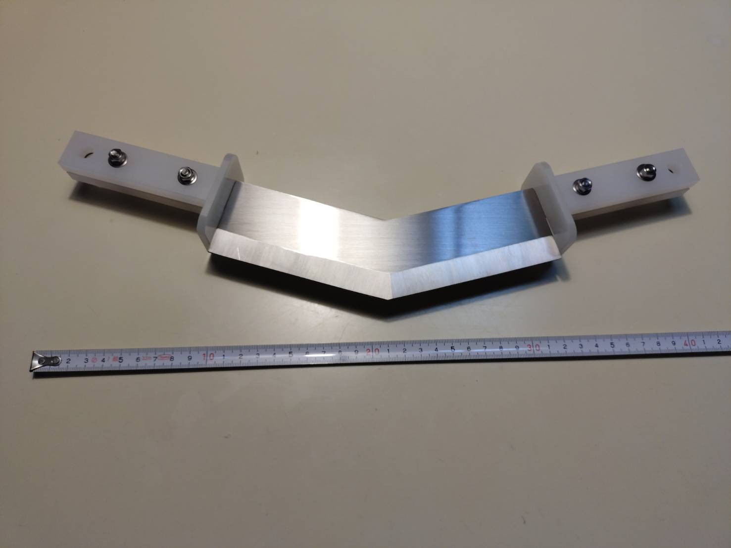 このため、普通の包丁で切る際、一度切れ目を入れてから一度抜かなくてはならず、この動作が難しいと感じていました。そこで、包丁を2個合体させた形を考案し、左右交互に傾けることで連続的に切断可能な現在の形になりました。