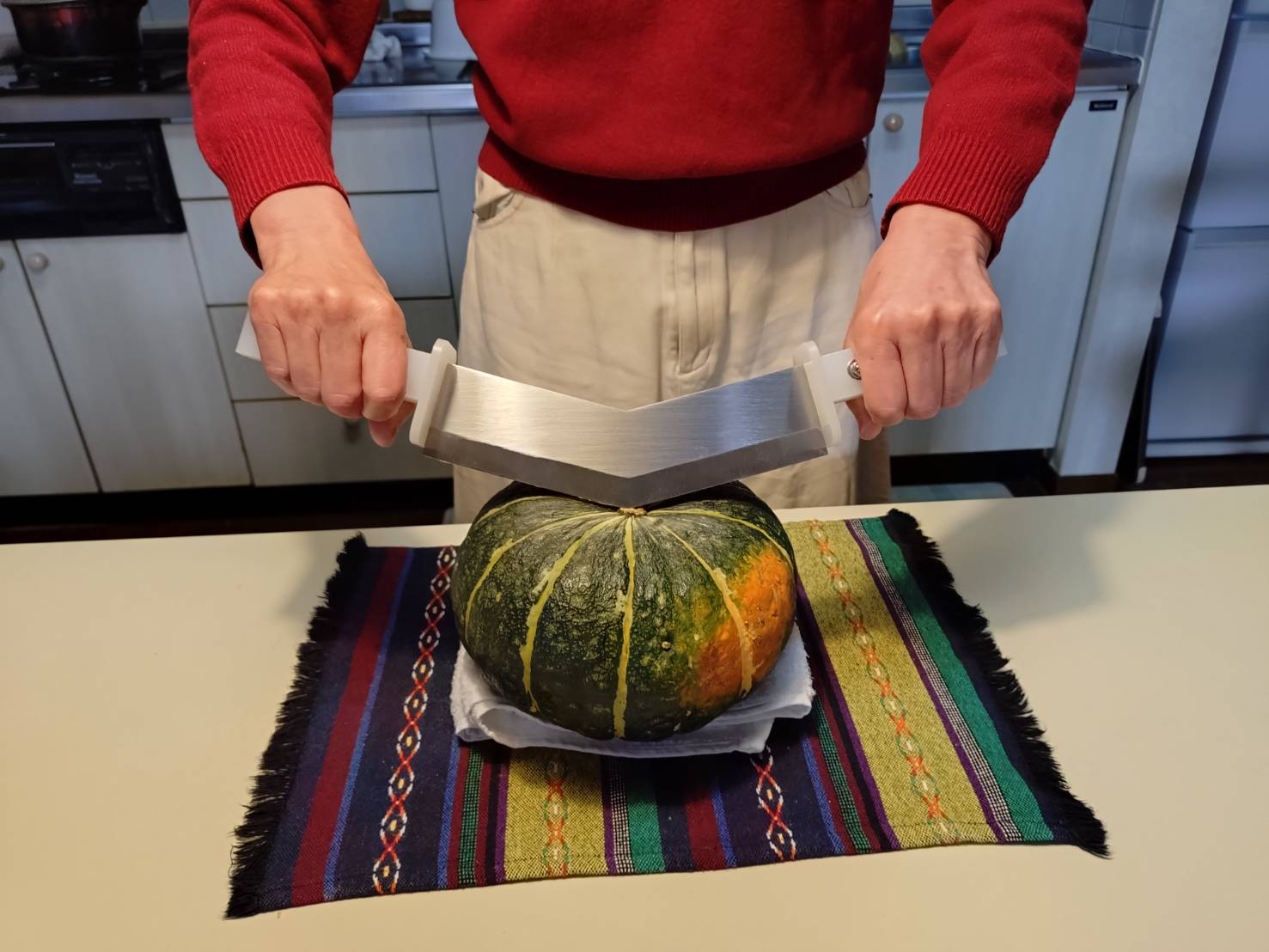 2) 食卓テーブルくらいの高さの台に、濡れたタオルをクッションとして置き、その上にかぼちゃのヘタを下にして、この包丁で左右交互に押し下げると簡単に半分に切れます。