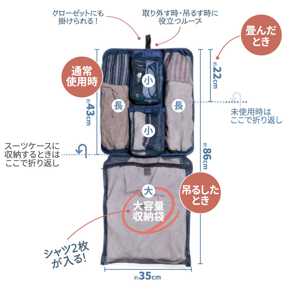 ・上部にループがついているので旅先でハンガーなどにそのままかけられます。また、帰宅後いつも旅行に持って行くものをそのまま収納できるから次の旅行準備も楽々です